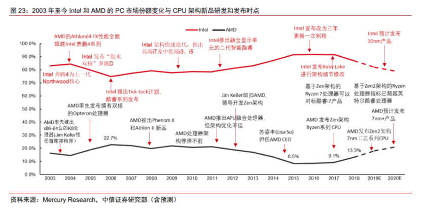 晶圆代工厂也是推动追赶者向行业龙头发起挑战的重要因素之一。AMD对英特尔的挑战就很好地印证了这一观点。长久以来,英特尔的CPU一直采用的是自家先进工艺,但英特尔10nm工艺迟迟未能面市,这为AMD提供了超越的机会。当时,AMD联手台积电,率先推出了基于7nm工艺的处理器芯片,在其新技术(Zen架构)的加持下,AMD YES的呼声也一度高过于Intel inside。