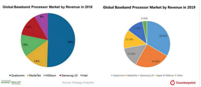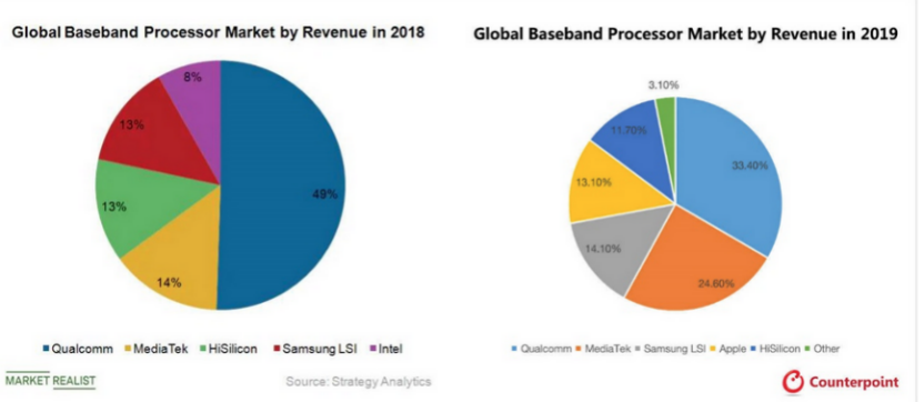 同样的故事在手机芯片市场中再次重演。在去年当中,联发科不仅推出了5G 基带芯片Helio M70,还于年底推出了基于7nm工艺和A77+G77架构的5G处理器天玑1000,以及面向中低端的5G SoC天玑800。通过在4G和5G手机芯片上的全面布局,联发科在去年当中的表现也令人惊艳——据Counterpoint的2019年全球手机芯片市占率报告显示,联发科在2019年以24.6%的市场占有率位居第二,仅次于高通,相较于2018年提升了10.6%,而高通却在当年下滑了15.6%。