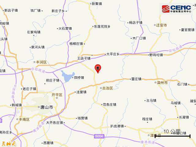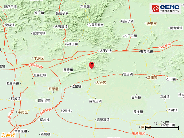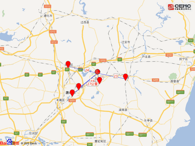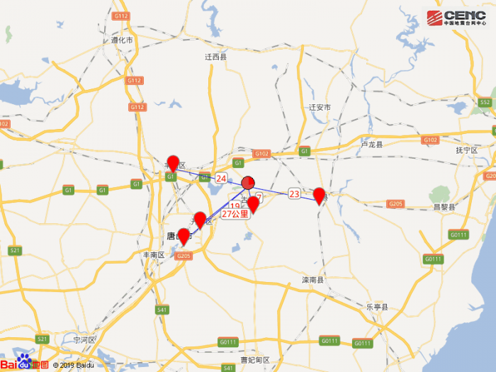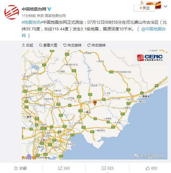 据中国地震台网微博消息,中国地震台网正式测定:07月12日06时38分在河北唐山市古冶区(北纬39.78度,东经118.44度)发生5.1级地震,震源深度10千米。震中距古冶区7公里、距开平区19公里、距滦州市23公里、距丰润区24公里、距路北区27公里,距唐山市28公里,距天津市132公里。