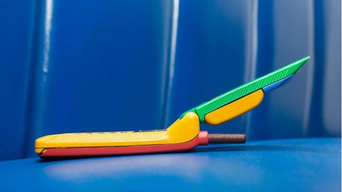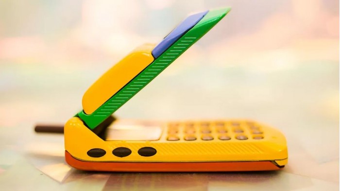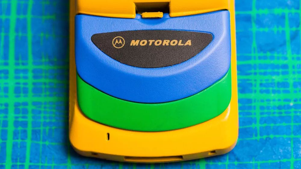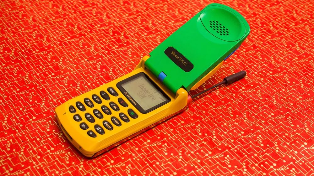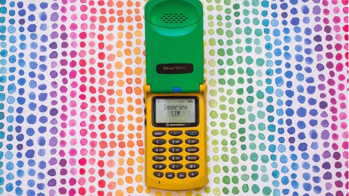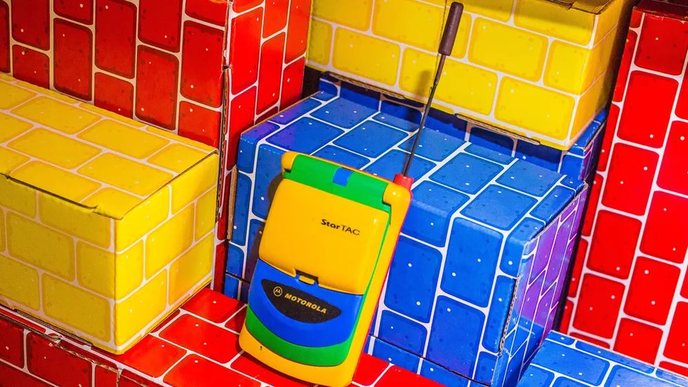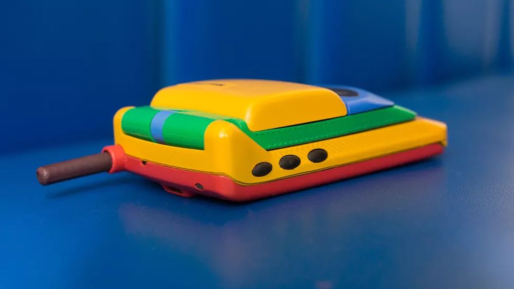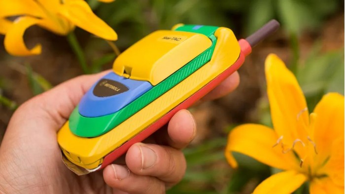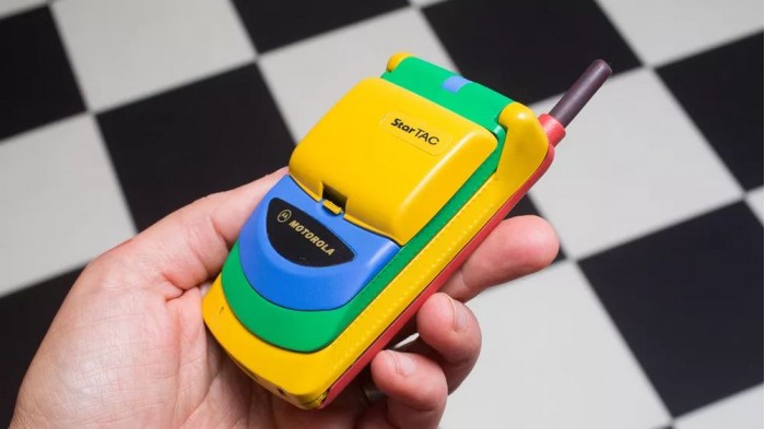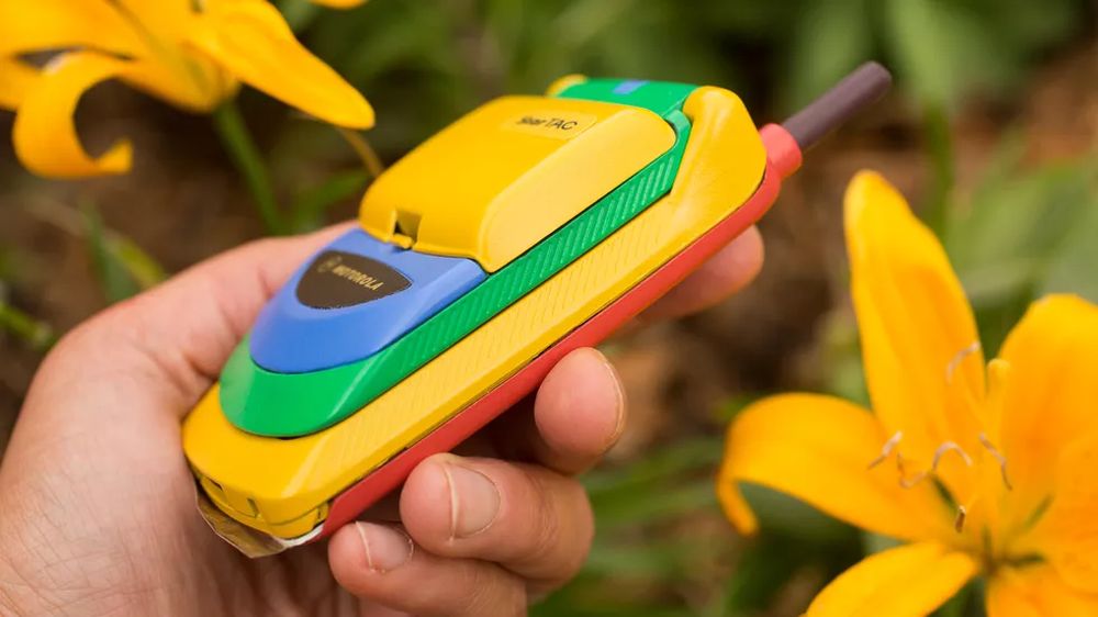 他在 eBay 上淘到了彩虹版摩托罗拉StarTAC,拿到现在来看它就像是一个小孩的塑料玩具,黄色的塑料机身、绿色的屏幕盖以及红色的背面,此外还有一根可以伸缩的天线。