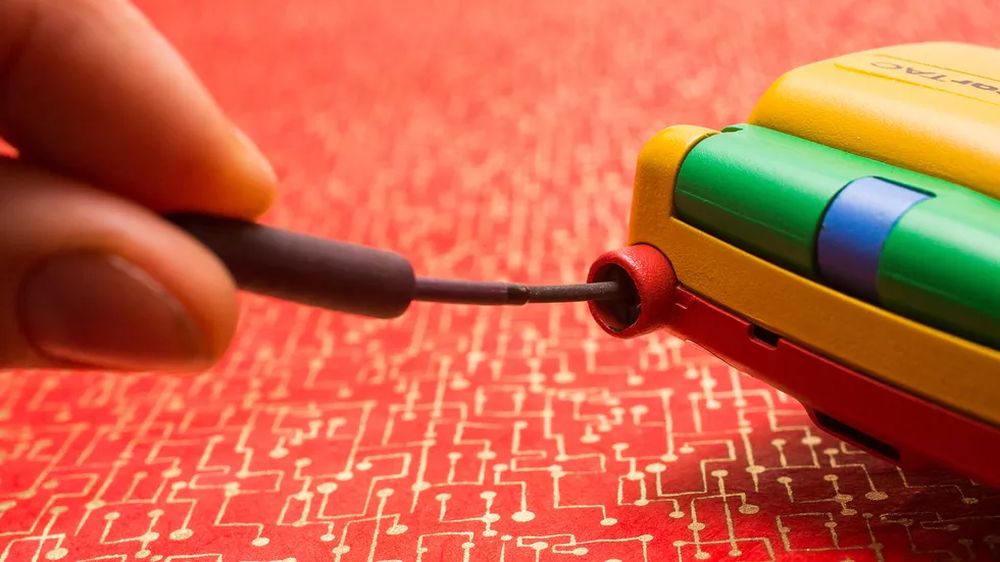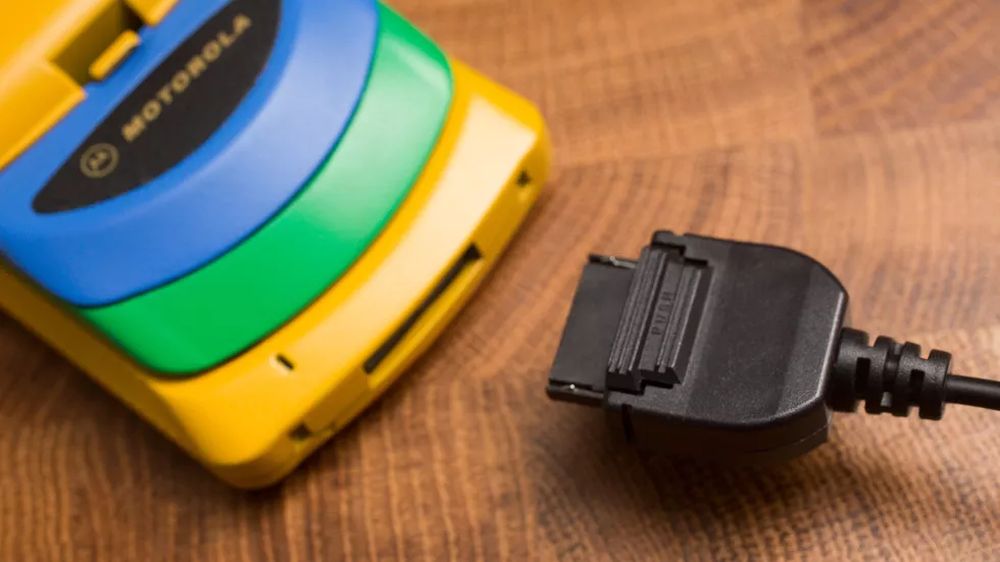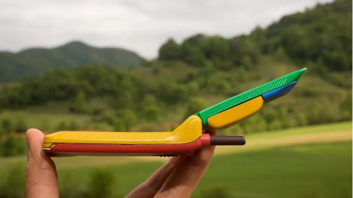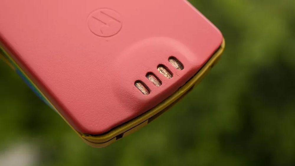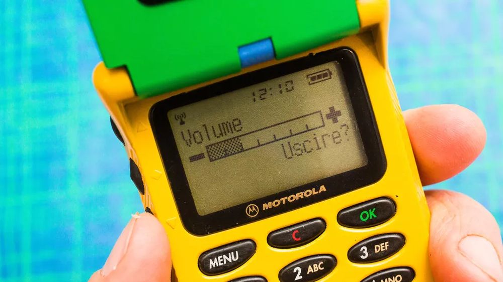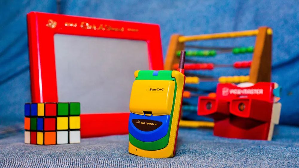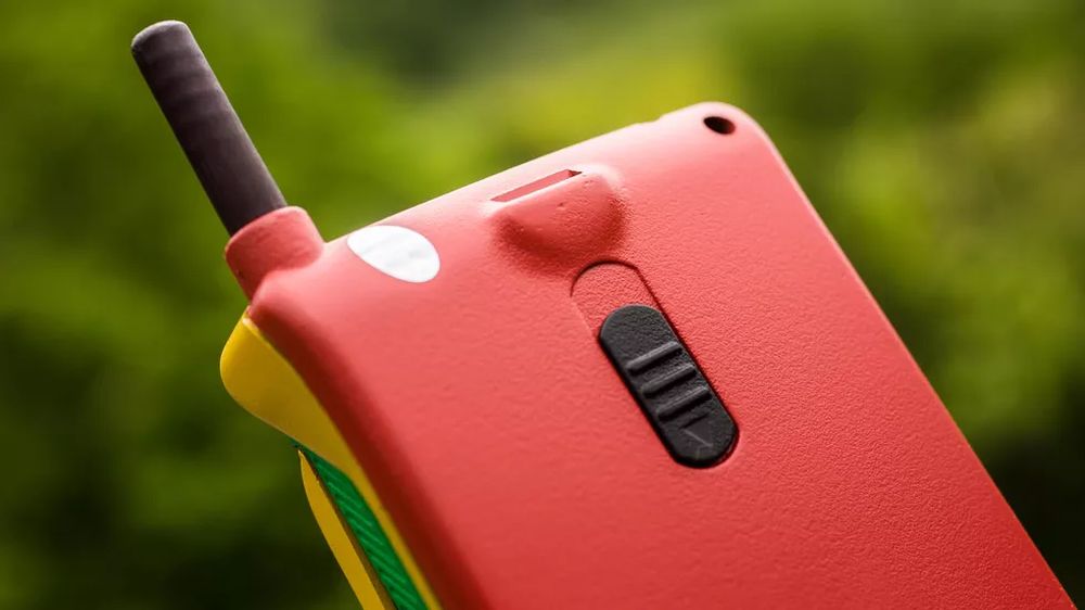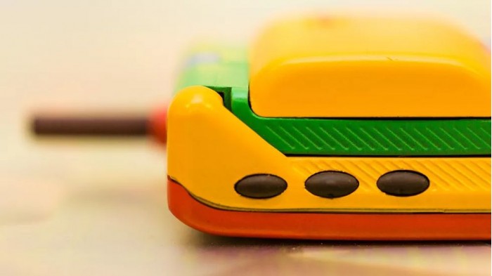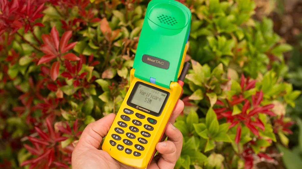 他在 eBay 上淘到了彩虹版摩托罗拉StarTAC,拿到现在来看它就像是一个小孩的塑料玩具,黄色的塑料机身、绿色的屏幕盖以及红色的背面,此外还有一根可以伸缩的天线。