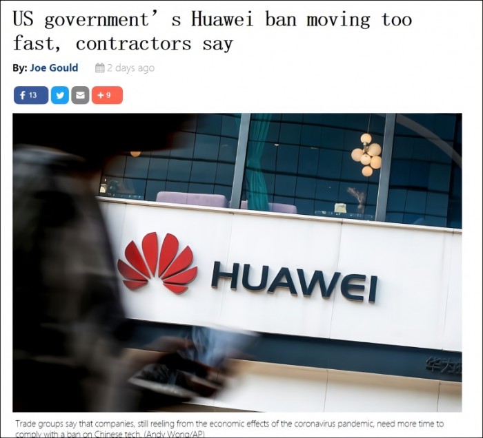 10日,美国防务新闻网发布题为《承包商称美国政府对华为的禁令进展太快》的文章,并指出,美国专业服务委员会与国防工业协会都认为当前不是“封杀”华为等中企的时候,而是应该更加关注美国如何从新冠疫情危机中恢复。国防工业协会认为美企需要更多缓冲时间,并称对华为等中企公司的禁令应该至少推迟一年。