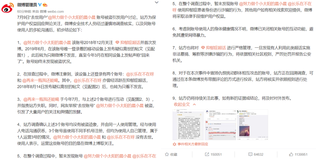 经过调查后,今天微博公布了结果,大意是:不存在账号被盗的情况,该博主并未去世,整件事情都是她自导自演的。