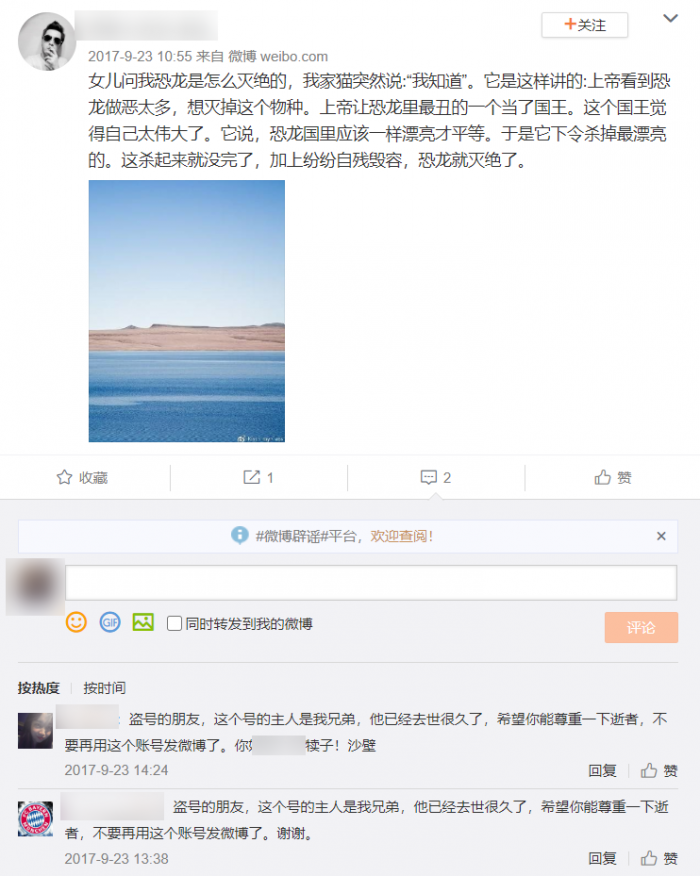 如果有这样的功能,当初徐二水( 于 2013 年去世的博主 )的账号也不会被盗号的人盗走,最后发一大堆营销信息,被新浪判别成 “ 僵尸号 ” 注销。