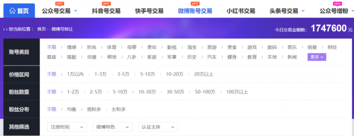 但你可能想象不到,这样的交易甚至催了不少第三方交易平台,大批的微博账号都在上面被列明情况,标价待售。