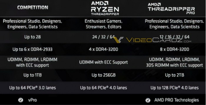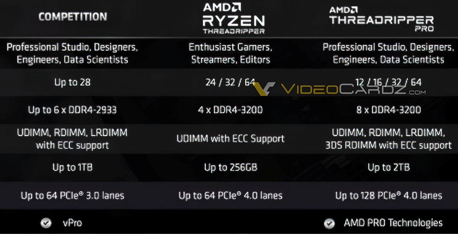 线程撕裂者PRO系列在针对专业工作室、设计师、工程师、数据科学家等更专业人群,提供12/16/32/64核心四种配置(反而没有24核心),内存开放到完整的八通道DDR4-3200,而且通吃UDIMM、RDIMM、LPDIMM、3DS RDIMM等各种规格,最大容量2TB,PCIe 4.0总线也开放到完整的128条,热设计功耗仍然维持全系280W。