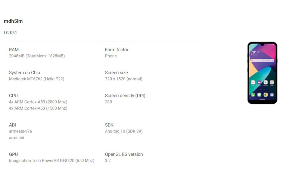 一款名为 LG K31 的设备最近在 Google Play Console 中被发现,基于曝光的规格,它应该是一款非常便宜的设备。K31 搭载了联发科的 Helio P22 处理器,并配备 2GB RAM。除了上述信息外,曝光的规格表还显示它将采用打孔屏的设计,具有 HD+(720 x 1520)分辨率,该手机还将搭载 Android 10。