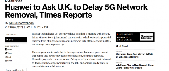 据英国和美国媒体7月12日报道,中国华为公司已经要求与英国首相鲍里斯·约翰逊会面,以达成一项协议,推迟英国政府将华为从英国5G网络设备供应商名单之中移除的时间。英媒称,这家中国电信设备制造商正寻求将这一时间推迟到2025年6月,也就是下次英国大选之后,预计新政府可能会改变决定,允许华为参与英国5G网络建设。