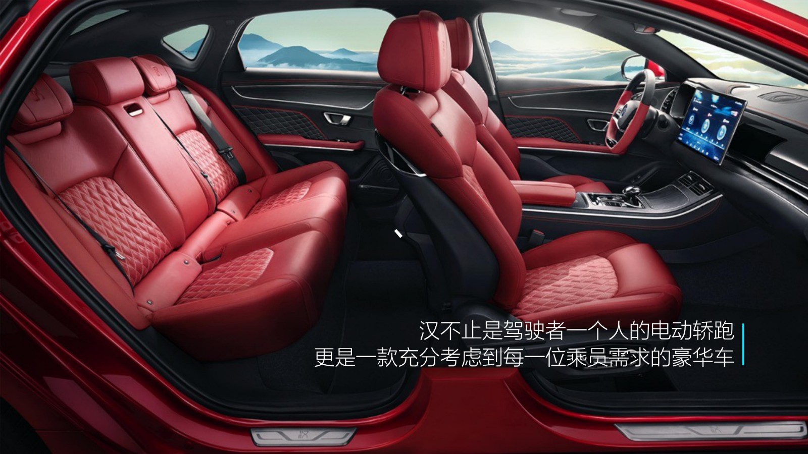 汉的内饰布局同样汲取了中式美学概念和古典设计。中国古代皇家建筑讲求左右对称,汉的中控台则以大尺寸悬浮式中控屏为中心,主副仪表盘等显示与功能区域沿中轴线向两侧延展,营造出主次分明的空间感;全液晶仪表盘、多功能方向盘、空调出风口和音响扬声器,在两侧以“品”字形对称排列,以高级空间层次感、和谐大方的氛围,营造出专属于汉的中式豪华风格。