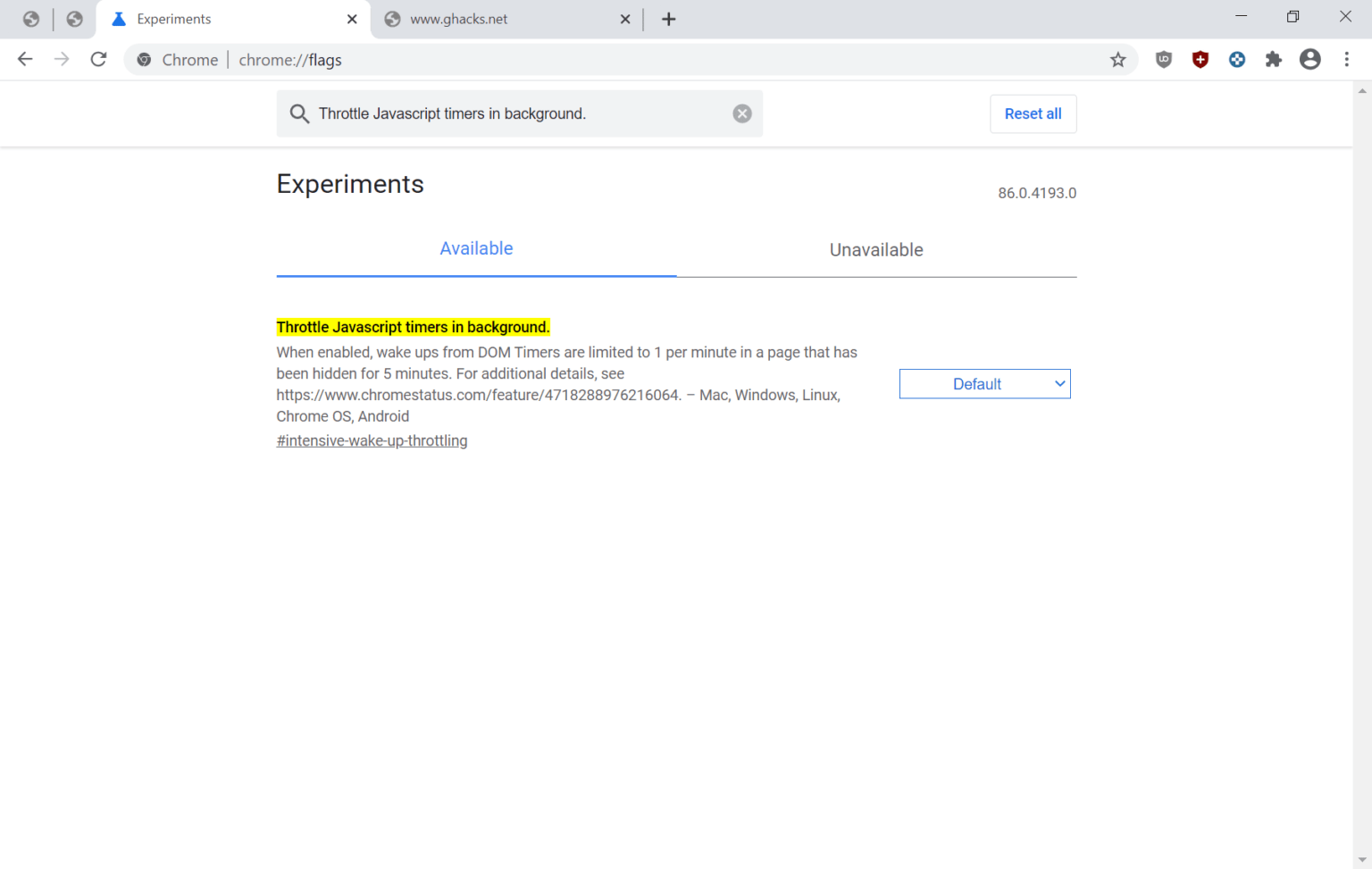 Chrome 86中添加了一项新的实验室特性,允许在当标签处于后台挂起时,关闭不必要的JavaScript计时器和跟踪器,以减少能源消耗,比如检查滚动位置的JavaScript计时器和跟踪器。