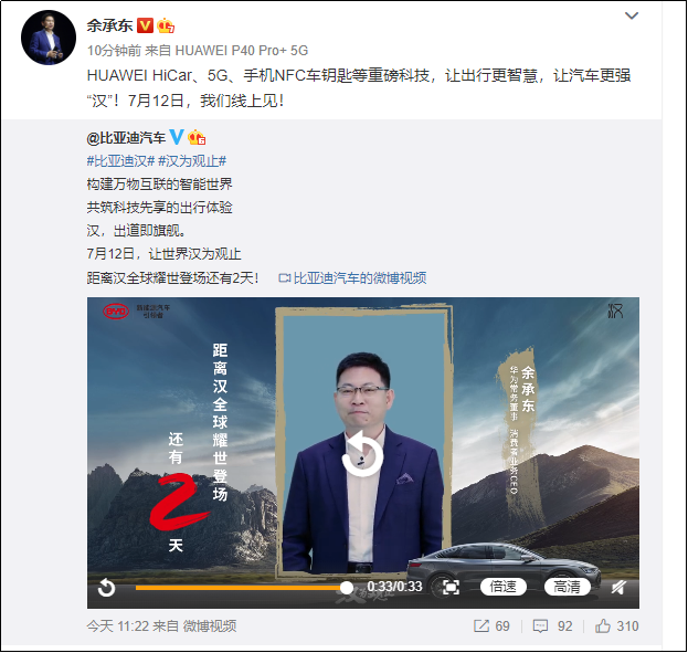 时隔6年多,余承东再次为比亚迪站台。近日,一张余承东和王传福共同体验比亚迪汉的照片在社交媒体上流传。在微博上,余承东也为比亚迪汉的发布会做了宣传。