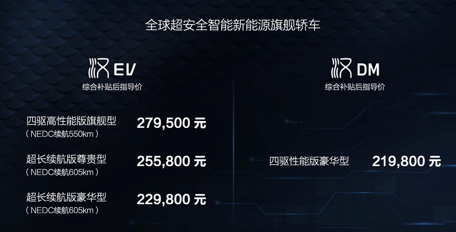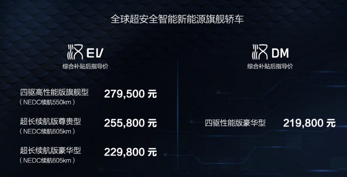在动力方面,四驱纯电版本0-100km/h加速时间为3.9秒,DM版本0-100km/h的加速时间为4.7秒,可以与传统燃油豪华车相媲美。