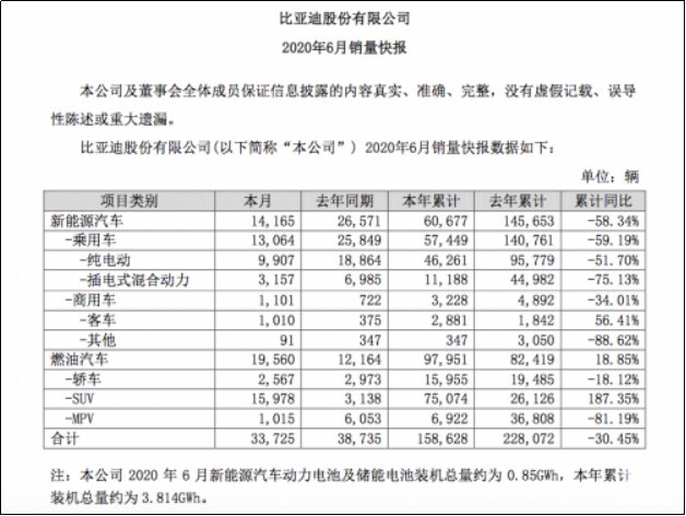7月7日晚,比亚迪发布的6月份产销报告显示,6月份公司汽车销量为3.37万辆,同比下滑12.93%;其中新能源乘用车销量1.31万辆,同比下降约49.46%。