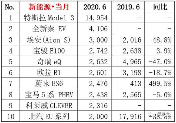 2020年6月国内新能源车销量排名,图片来源:乘联会