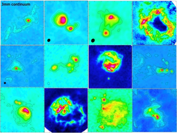 图说:12个ATOMS观测的恒星形成区的ALMA 3 毫米的连续谱图像,等值线或者亮度最强的地方正形成大质量恒星