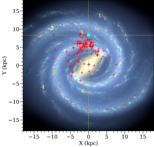 ATOMS项目观测的146个大质量恒星形成区(红色+)在银河系的分布。大部分观测目标都分布在旋臂上。