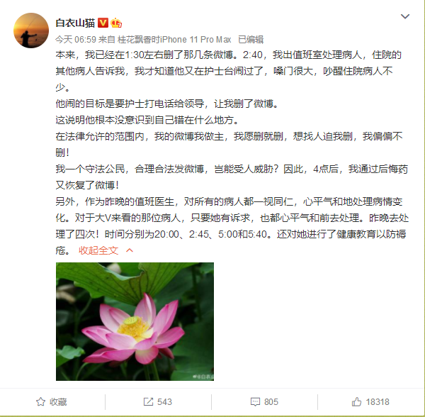 @白衣山猫在微博回顾了事件过程,原来,7月12日凌晨4:30,一个外伤东北籍病人入院,脚上有一个3cm的小伤口,病人自己拒绝缝合,当晚病人又变主意,要缝,医生休息在家又赶回医院,病人又不要缝,因此医生回家去了。