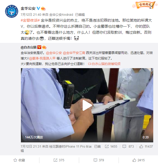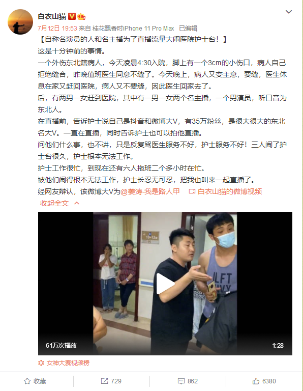 近日,浙江金华,一位6万粉丝的微博大V因家属入院治疗问题在医院与医护人员起冲突,还进行了直播,护士长忍无可忍,请来了医院里一位微博439万粉丝的大夫直播。据了解,这位6万粉丝的微博大V是@姜涛-我是路人甲 ,而439万粉丝的大夫是@白衣山猫。