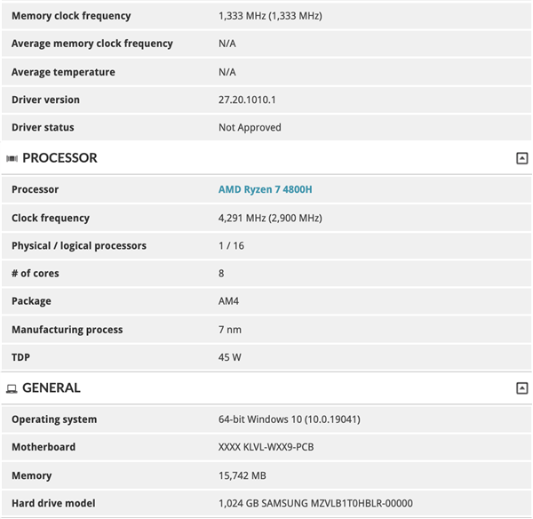 一是8核心16线程的锐龙7 4800H处理器、16GB DDR4-2666MHz内存、三星PM981a 1TB NVMe SSD固态盘。