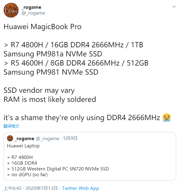 荣耀将于7月16日发布新一代MagicBook锐龙笔记本,显然会配备7nm工艺、Zen2架构的全新锐龙4000系列,但具体采用低功耗的锐龙4000U系列,还是高性能的锐龙4000H系列,目前还没有官方消息。今天,推特曝料大神@_rogame 公布了全新MagicBook Pro锐龙本的配置情况。