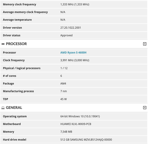 二是6核心12线程的锐龙5 4600H处理器、8GB DDR4-2666MHz内存、三星PM981 512GB NVMe SSD固态硬盘。