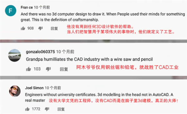 从视频中可以看出,这位爷爷不用任何现代机械工具,就能徒手打造鲁班凳、苹果锁、拱桥、将军案、会动的小猪佩奇等木制品。其YouTube频道播放量已经突破2亿,被网友称为“当代鲁班”。