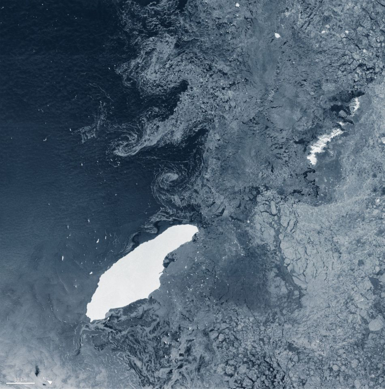 据报道,A-68在最初两年的大部分时间里都漂浮在它脱离的冰盖附近,因为它被其他海冰包围着。在此期间,它只是失去了一小块冰,这块冰被称为A-68B,而最初的那块则被重新命名为A-68A。