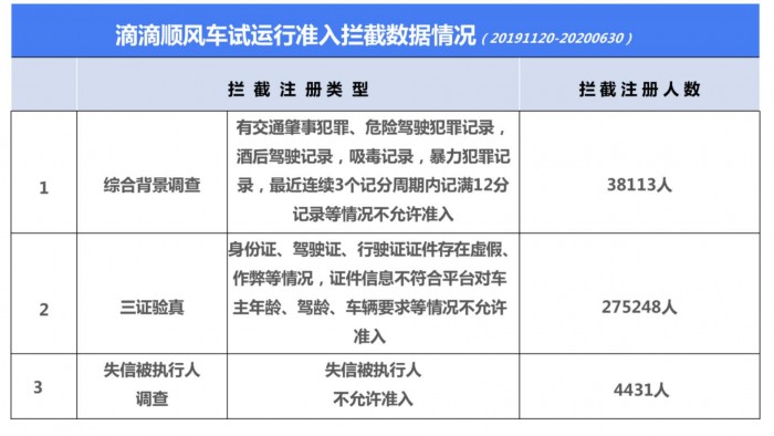7月13日,滴滴顺风车对外发布《试运行安全透明度报告》,首次对外披露顺风车安全情况。报告显示,试运行期间,滴滴顺风车驳回不符合新认证要求(综合背景审核、失信人筛查、三证验真)的车主317792人,对824名名代刷脸及使用作弊工具的用户永久暂停服务。