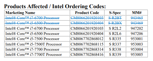 不过这个名单现在有变化了,2款14nm工艺的Skylake处理器被Intel从退役名单上删除,主要是面向IoT物联网领域的酷睿i7-6700及酷睿i5-6500处理器,其S-Spec编号跟另外2款处理器是不一样的。