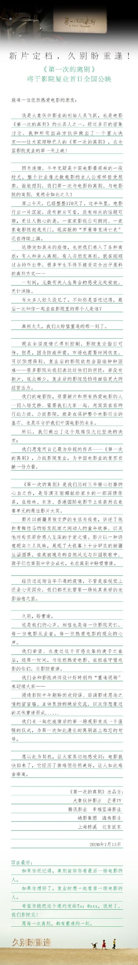 所以,我们做出了这个艰难但无比坚决的决定:我们愿意用自己最为珍视的作品——《第一次的离别》,力挺影院复业,为中国电影业的复苏贡献一份力量。