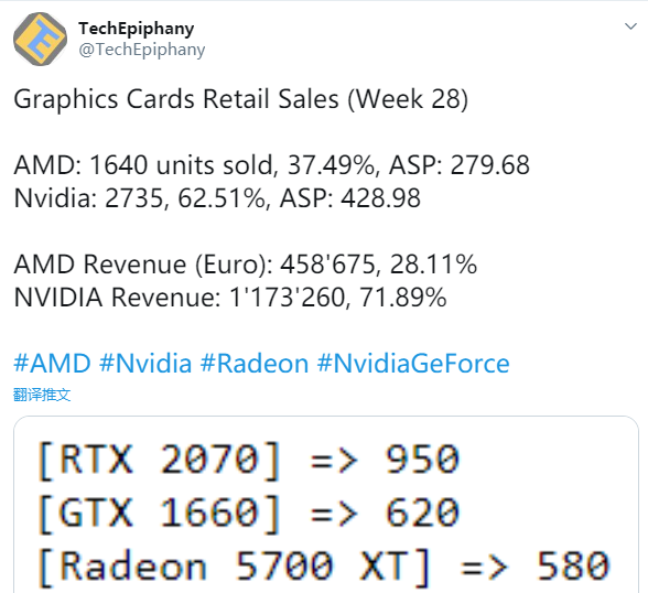具体产品方面,RTX 2070持续热销,当周卖出950块,之后是GTX 1660 620块,RX 5700 XT表现也不错以580块排名第三,之后是RTX 2060 405块、RX 580 240块、RX 5500 XT 230块、RTX 2080 220块……