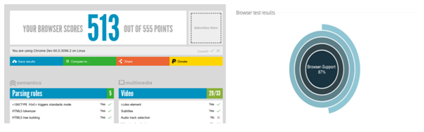 龙芯浏览器的HTML5跑分高达513分(总分555分),CSS标准支持达到87%,其中CSS1、CSS2、CSS3已达到100%。