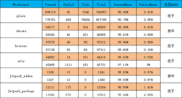 比如其中的一项mochitest,测试用例数多达近百万,都是浏览器发展过程中沉淀下来的精华,龙芯全部进行了分析与调试,确保不会出现功能、稳定性等问题,龙芯也是国内极少能做到该层面的浏览器团队。