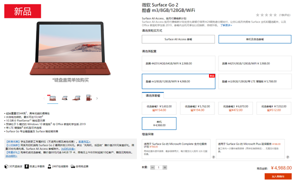 很奇怪的产品组合,酷睿m3款竟然没有Wi-Fi版本,直到今天才终于补上:微软官方商店里已经可以看到新的酷睿m3/8GB/128GB/Wi-Fi版本,定价为4988元,相比LTE版本便宜了800元。