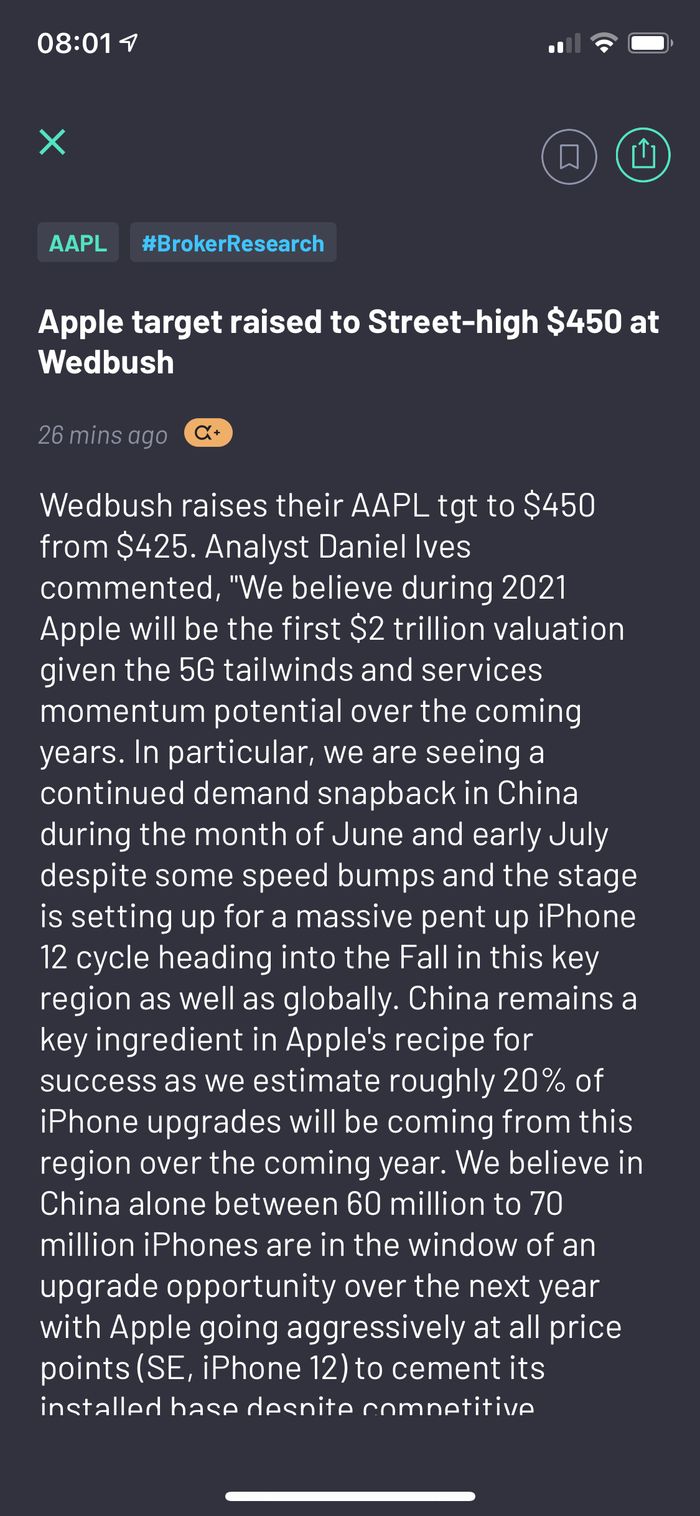 该市场分析公司已将AAPL的12个月目标价从425美元上调至450美元。