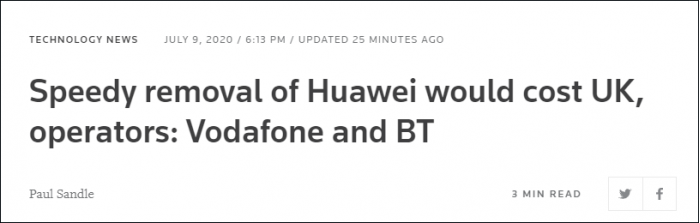 当时,沃达丰的技术主管明确表示,弃用华为代价太大。“移除已安装的华为设备预计将花费数十亿英镑”。