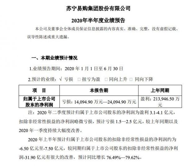 7月13日消息,苏宁易购今天对外发布2020年上半年业绩预告,称2020年二季度预计归属于上市公司股东的净利润为盈利3.1-4.1亿元,扣除非经常性损益的净利润略微亏损,预计亏损1.5—2.5亿元,较上年同期以及2020年一季度持续大幅度改善。
