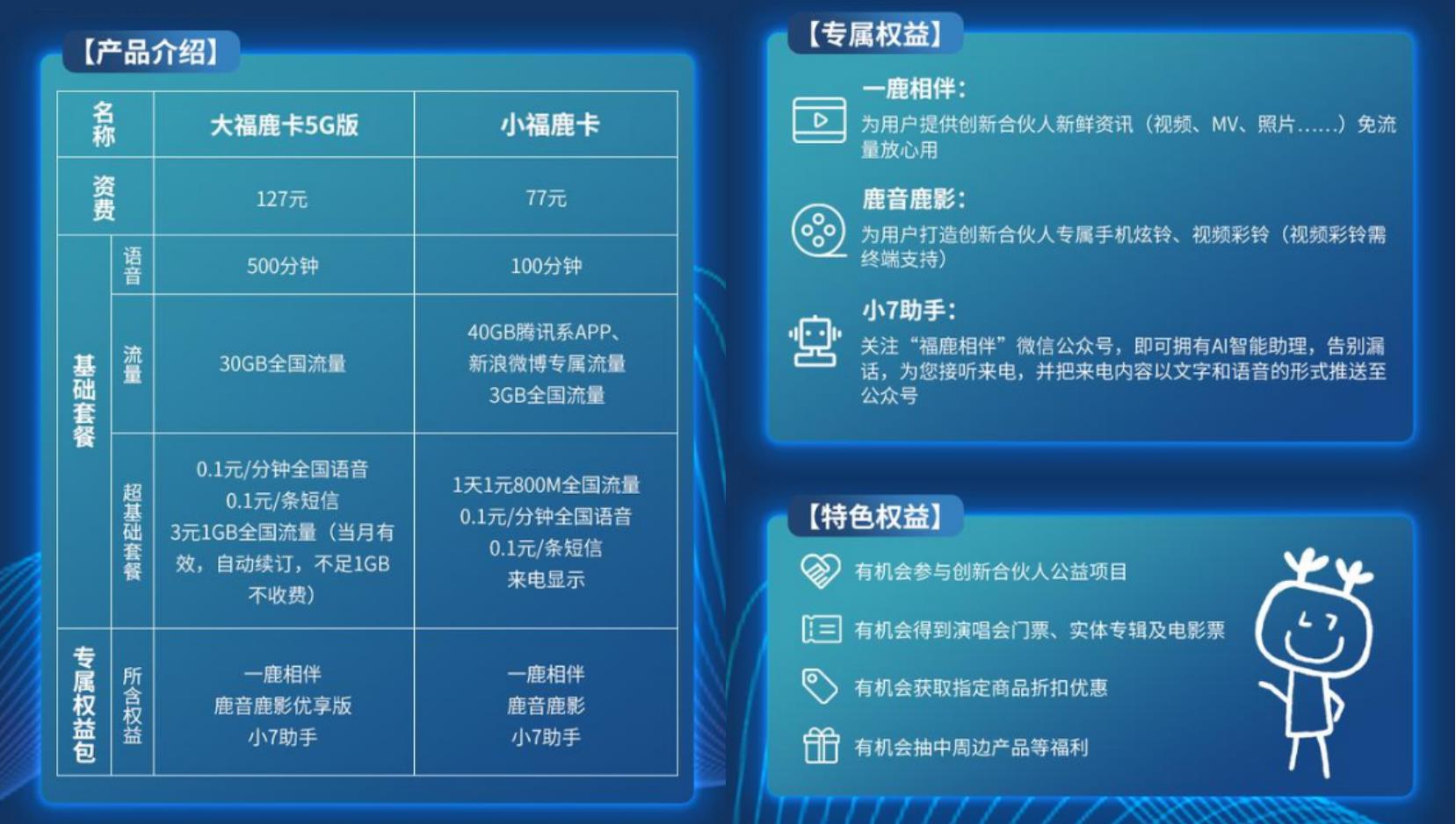 与中国移动更注重动感地带的品牌营销不同,中国联通更在意借助鹿晗的明星特性宣传具体套餐。在发布合作宣传新闻的同时,中国联通同步“福鹿相伴卡”,包括“小福鹿卡”和“大福鹿卡5G版”两款组合套餐,套餐用户均能享受超多鹿晗“专属权益”。
