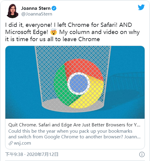 Joanna Stern 写道,她已将 Google Chrome 从自己的 MacBook 中扫地出门,并投入了 Safari 和 Edge 的环保。