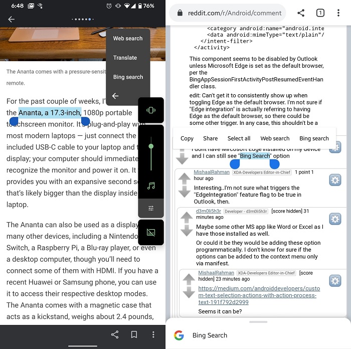 微软悄然更新了 Outlook 应用的 Android 客户端,同时将必应搜索集成到了 Android 移动操作系统的长按唤出菜单中。在选择并长按文本片段时,菜单在显示常规的剪切、复制和 Web 搜索功能外,还可显示专门的必应搜索选项。