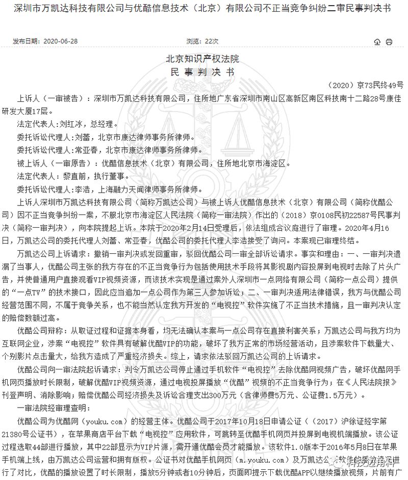 据知产北京公众号消息,近日,北京知识产权法院二审审结了一起不正当竞争纠纷案,案件围绕的核心之一便是关于免费观看VIP视频资源、屏蔽视频广告的问题。万凯达公司经营了一款叫做“电视控”的软件,可以将手机中播放的视频投屏到电视观看。但通过“电视控”将优酷网的视频内容投屏到电视时,可以屏蔽原视频片头的广告,而且普通用户也可以直接观看优酷网VIP视频资源。