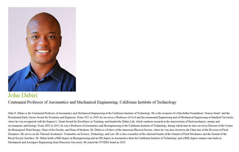 2005年到2015年,约翰·达比里任教于加州理工学院,是航空航天和生物工程教授,曾担任生物启发风能中心主任、系主任等职。2015年他前往斯坦福大学任教,担任土木与环境工程、机械工程教授,也是达比里实验室的负责人。2019年他重回加州理工学院,担任航空航天和和机械工程教授。