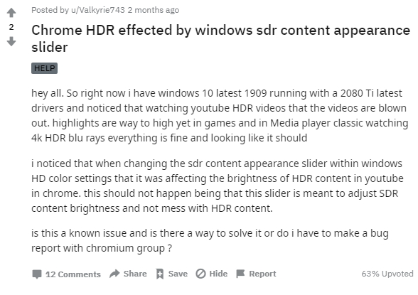 Reddit 网友抱怨称,他们在使用 Chrome(v81+)和系统自带的 Edge 浏览器的时候,遇到了浏览器无法正常播放 HDR 内容的问题。有网友写道:在对“视频播放”设置项中的滑块进行调节之后,YouTube 上的 HDR 内容的亮度级别就出现了不准确的问题。