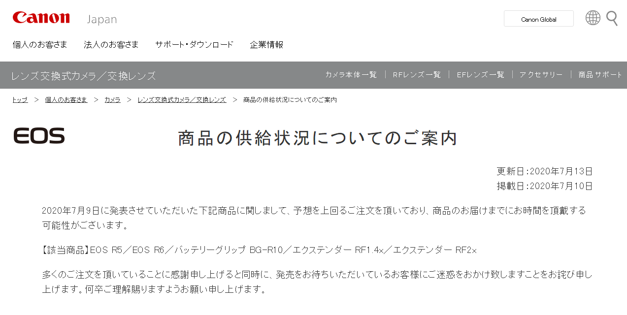 7月13日,据佳能日本官网显示,由于订单太过火爆,新发布的佳能EOS R5、EOS R6等新品将可能延迟发货。据发布的产品供应状况指南显示,佳能EOS R5、EOS R6、电池盒兼手柄 BG-R10、增倍镜 RF1.4×、增倍镜 RF2×五个产品由于订单超出了预期,将会延期交付产品。对于带来的不便,深表歉意。