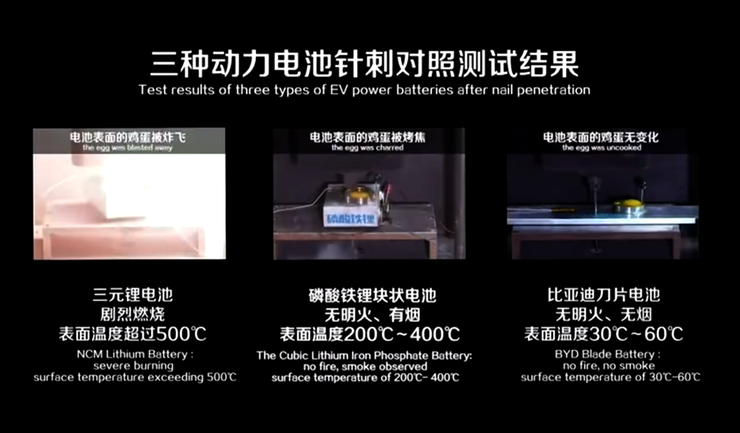 刀片电池之所以能取得如此热度,与其发布会上公布的三元锂电池、磷酸铁锂电池和刀片电池三种电池针刺对照测试结果完整视频息息相关。