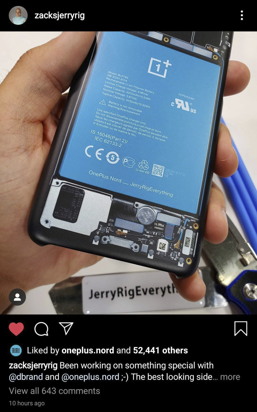 现在OnePlus官方并没有透露电池的尺寸。但如果你还记得,几天前,我们展示了OnePlus Nord将拥有的官方保护壳,而其中一个保护壳恰好是来自JerryRigEverything的Zack拆机壳。Zack继续在他的Instagram上再次预告了这个手机壳,但这一次,手机壳上的电池容量被非常明显地透露了出来。现在你应该知道,这绝不是官方的透露,但从这些手机壳的表示方式来看,是相当到位的,可以肯定地说,OnePlus Nord事实上将拥有4115毫安时的电池。这对于一款预算规格的设备来说,已经相当不错了。