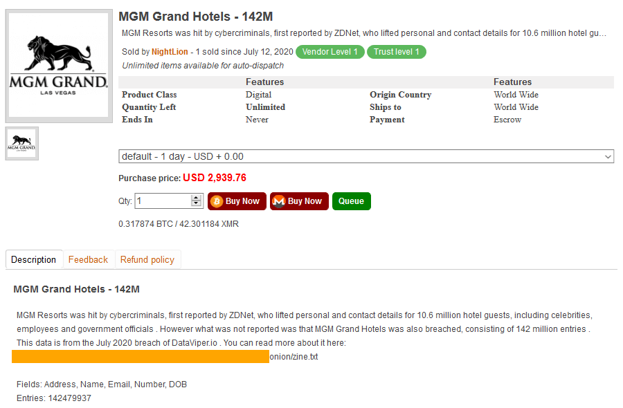 美高梅的细节来自于去年该酒店的一次数据泄露,一名黑客未经授权访问了一个云端服务器,其中包含了以往客人的信息。该连锁店表示,已经按照国家法律的要求,通知了所有受影响的人。发布广告的人声称,这些数据实际上来自于数据泄露监测服务DataViper最近的一次攻击,但该公司否认拥有一份完整的美高梅数据库,并表示黑客试图破坏该公司的声誉。