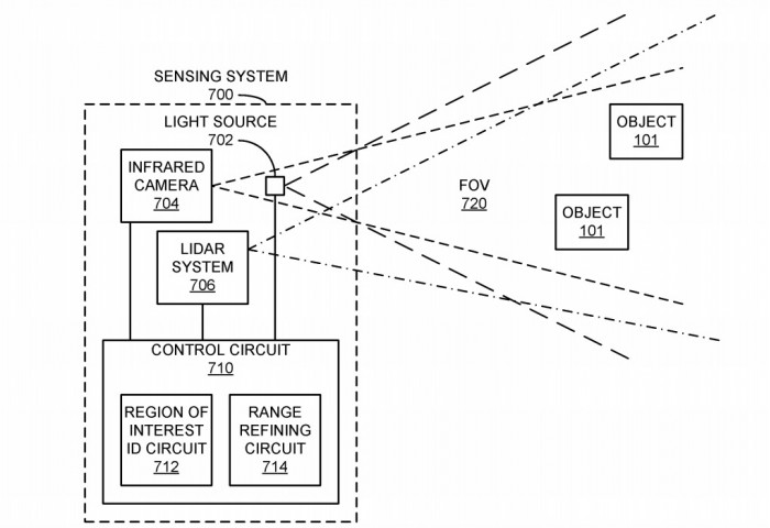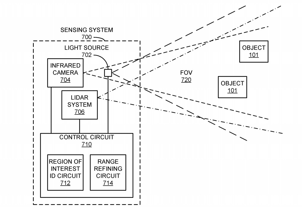 苹果建议该系统可以与现有的激光雷达设置一起使用,以创建一个混合系统,以不同的精度水平检测物体。该专利中详述的低精度光脉冲相机设置可用于为车辆的自主系统生成感兴趣的区域,然后该系统可告知激光雷达元件应将其扫描工作集中在何处。这样做可以实现全场景覆盖。