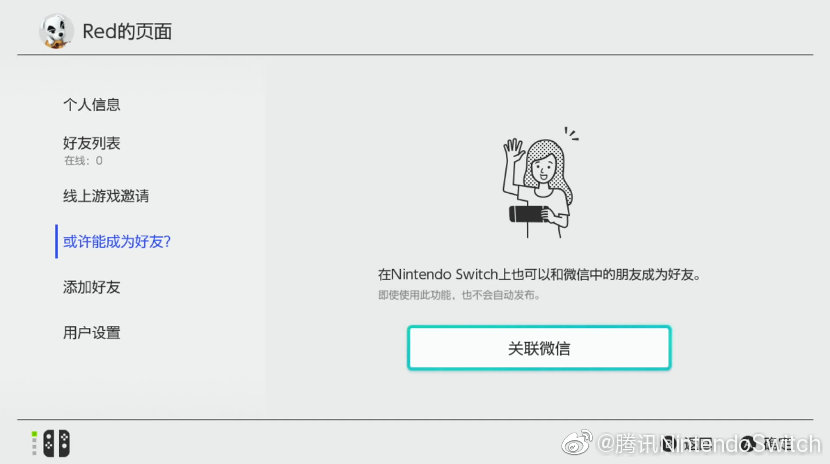 在Nintendo Switch 10.1.0系统中,方便微信朋友之间相互添加Nintendo Switch好友的新功能正式上线。当你点击主页左上角的“用户头像”进入“我的页面”后,会发现该页面中新增了“或许能成为好友?”选项。