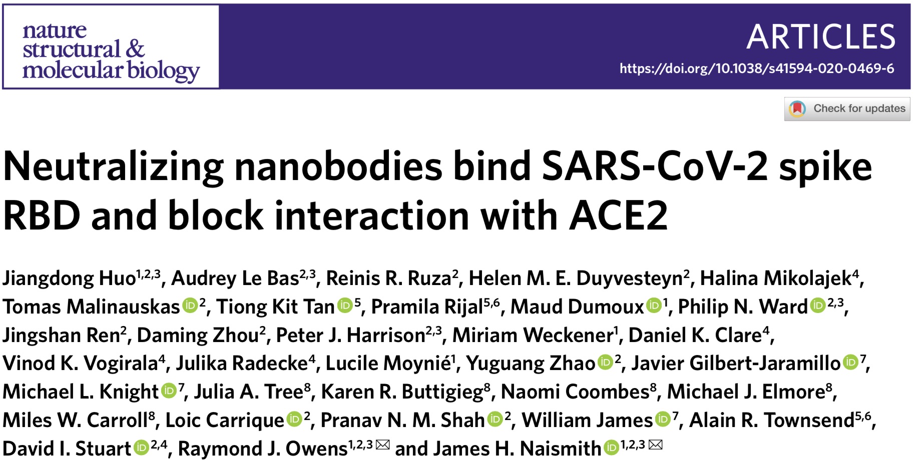 当地时间7月13日,该研究发表于《自然-结构和分子生物学》(nature structural&molecular biology)。论文通讯作者为牛津大学领导纳米抗体项目的Raymond J. Owens教授,以及牛津大学结构生物学教授、罗莎琳德·富兰克林研究所主任James H. Naismith教授。